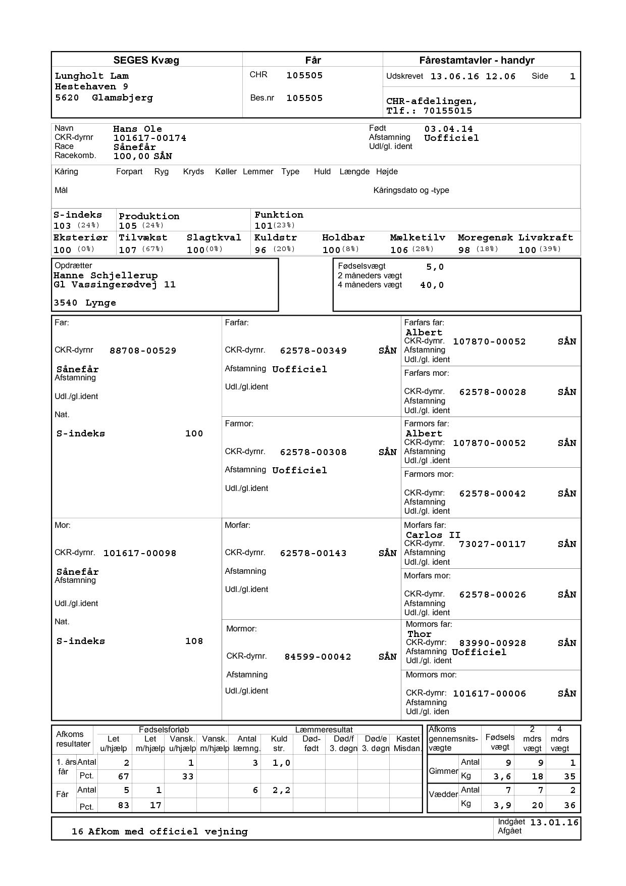 Hans Ole er købt som vædderlam til avl hos Hanne og Ole Schjellerup i 2014. Han er en harmonisk, velbygget og afbalanceret vædder.